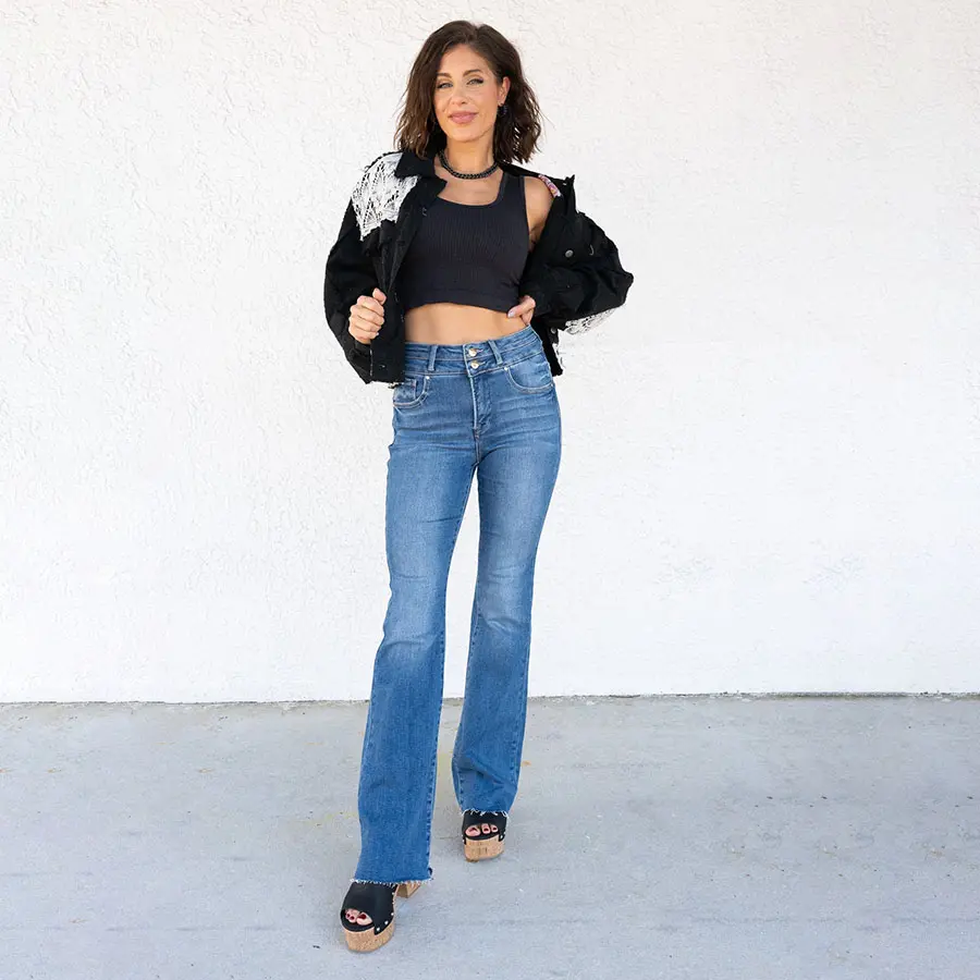 This High-Rise Tummy Control Bootcut Denim not only provides a flattering fit, but also features a double waist-band with 2 buttons and is completely non-distressed! Say goodbye to muffin tops and hello to a stylish look that will have you feeling like a boss